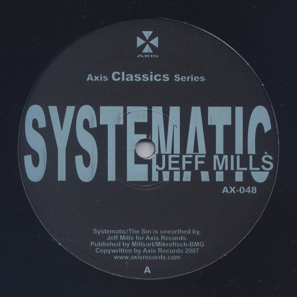 "Systematic/The Sin" (Axis Classics) "Systematic" was previously released on the 88382 CD by Jeff Mills (1997). Designed for AX-012 "Humana" EP, this track never made the final release due to the time constraints of the 12" vinyl. The classically arranged track "The New Arrivals" (b1) was the final replacement. "The Sin" has an interesting history. Created in 2005. Originally designed for Purpose Maker 16 (PM-016) under the first title "Spellbound", this track was created during a period I was interested and researching the powers of voodoo. Because of the extreme frequencies used in the track, it underwent 3 seperate mastering sessions before arriving at this final compromise. Though not completely satisfied with the final mix, I thought that by allowing such extreme frequencies on the hi and low end of the EQ scale and depending on the sound system and the ears of the DJ and listeners, the track would be preceived with hallucinative effect. - Jeff Mills Axis Classics Series. Published by Millsart/Mikrofisch-BMG. Copywritten by Axis Records 2007. Mastered at Sound Enterprises (NSC), Detroit