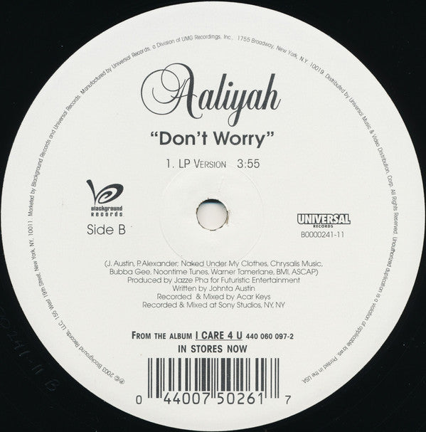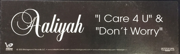 Released in a generic, black, stickered cardboard sleeve. [Sticker © 2003 Blackground Records, LLC. [Label side A Published by Virginia Beach Music, Mass Confusion Inc., Warner Chappell Music, ASCAP Produced [… for Timbaland Productions, Inc. Recorded at Music Grinder Studios & Magic Mix Studios, LA,CA Mixed at Capitol Studios, LA, CA [Label side B Published by Naked Under My Clothes, Chrysalis Music, Bubba Gee, Noontime Tunes, Warner Tamerlane, BMI, ASCAP Produced [… for Futuristic Entertainment Recorded & Mixed at Sony Studios, NY, NY [Label both sides From the album I Care 4 U 440 060 097-2 in stores now ℗© 2003 Blackground Records, LLC, [… Printed in the USA.