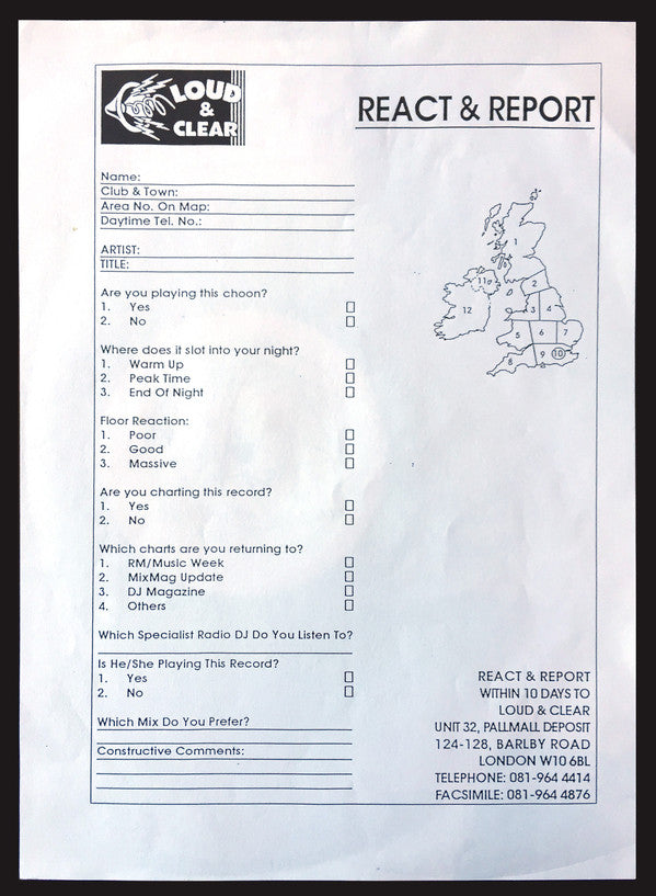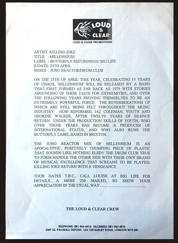 Promo 12" with a pink or grey label, packaged in a plain black sleeve and a "Promo Copy" sticker, with a Killing Joke Millennium logo stamp on the b-side. Limited run of 750 copies, each copy individually hand numbered. No specific titles appear on release. Some copies include an A4 promo slip.