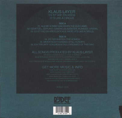 Black vinyl edition. All Songs Produced by Klaus Layer Recorded & Mixed by Klaus Layer in Germany Manufactured & Distributed by Redefinition Records, LLC (NJ/DC) Mastered by K-Def. Design by John N. Exec Produced by Klaus Layer, John Notarfrancesco, Earl Davis, Tim Ottowitz