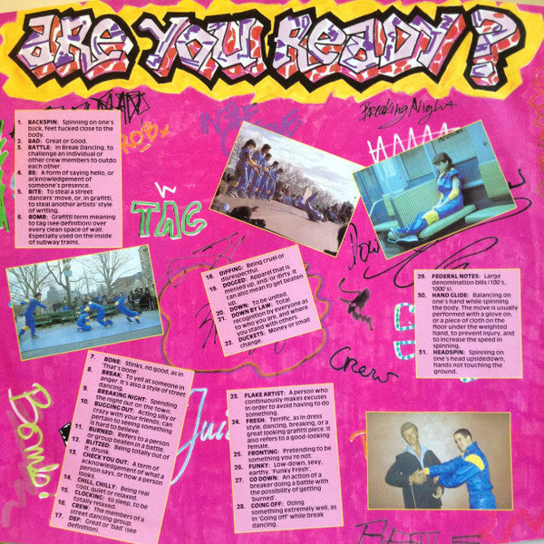 Original sound recording made by Charisma Records Ltd Printed & manufactured in the U.K. A1, A3, A4, B2, B3. Soldier Blue Music / Charisma Music / Chappell A2. MCA Music Ltd B1. Memory Lane Music Ltd Rock Steady Crew appears on outer sleeve; The Rock Steady Crew on labels. "Ready For Battle" appears on outer sleeve; "Ready For A Battle" on labels. "Uprock" appears on outer sleeve; "Up Rock" on label. "(Hey You) The Rock Steady Crew" appears on outer sleeve; "Hey You (The Rock Steady Crew)" on label. Includes color printed inner sleeve with 62 slang word definitions.