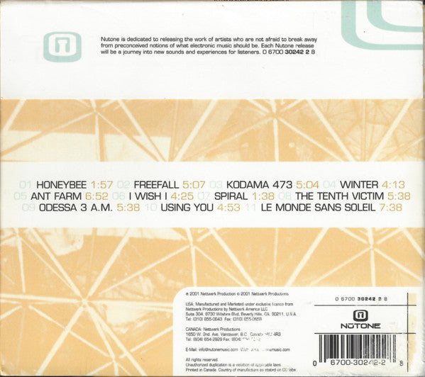 Issued in a digipak with a paper outer cover (folded over top and extending 1.75" down back). Track 8 duration is printed as 5:38; corrected duration in tracklist. Catalog number 0 6700 30242 2 8 is printed on back cover, spine and disc with 30242 2 in bold. [Back cover, typo as on release ℗ 2001 Nettwork Production © 2001 Nettwork Productions USA: Manufactured and Marketed under exclusive license from Nettwork Productions by Nettwork America LLC CANADA: Nettwork Productions Printed in Canada. Country of manufactured as stated on CD label [Disc Made in USA [Inside front cover [Track 4 written by credit adds: (Big World Songs) [Track 5 written-by credit adds: (Footlodgedindoor Music) Produced and recorded by Tom Third (1996-2001); mastered by Ted Jensen at Sterling Sound, New York; CD preparation by Greg O'Shea at Umbrella Sound Studios, Toronto; special thanks to all guest musicians, Mark Jowett and all at Nutone/Nettwerk, Christy Garland, John Oswald, Ken Myhr, Jim Paterson, Jim and Grace Third [Other The human silhouette with "60 HZ" on the front cover also appears on Tom Third's two earlier releases' back covers, [r913229, and [r151619.